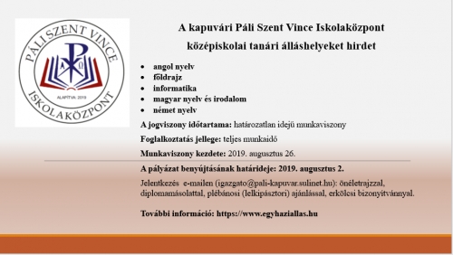 2019. szeptemberétől az egykori Felsőbüki Nagy Pál Gimnázium már a Páli Szent Vince Katolikus Iskola tagintézményeként kezdi meg működését a diákok számára. Az új rendszerű iskolában szükség van új tanerőkre, ezért a Katolikus Iskola az alábbi képesítéssel rendelkező tanárok jelentkezését várja 2019. augusztus 2-ig. : angol nyelv földrajz informatika magyar nyelv és irodalom német nyelv A jogviszony időtartama: határozatlan idejű munkaviszony A munkaviszony kezdete: 2019. augusztus 26. Jelentkezés emailben: Ez az e-mail-cím a szpemrobotok elleni védelem alatt áll. Megtekintéséhez engedélyeznie kell a JavaScript használatát. önéletrajzzal, diploma másolattal, plébánosi (lelkipásztori) ajánlással, erkölcsi bizonyítvánnyal Twitter