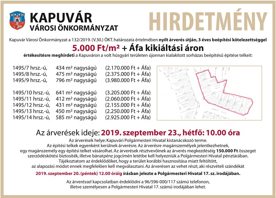 Kapuvár Városi Önkormányzat a 132/2019. (V.30.) ÖKT. határozata értelmében nyílt árverés útján, 3 éves beépítési kötelezettséggel meghírdeti értékesítésre Kapuváron, a volt Húsgyár területen újonnan kialakított sorházas beépítésű építési telkeit. 2019. szeptember 23. hétfő 10:00 az árverés időpontja, melyen 8 db telek kerül licitre. Twitter