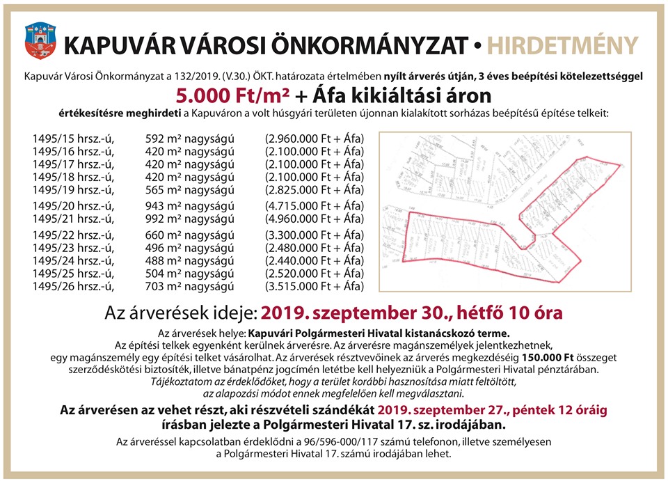 Folytatódik a volt Húsgyár területén kimért sorházas telkek licitje! 2019. szeptember 30-n hétfőn 10:00-kor lehet újból licitálni. Ezúttal 12 telek vár gazdára.