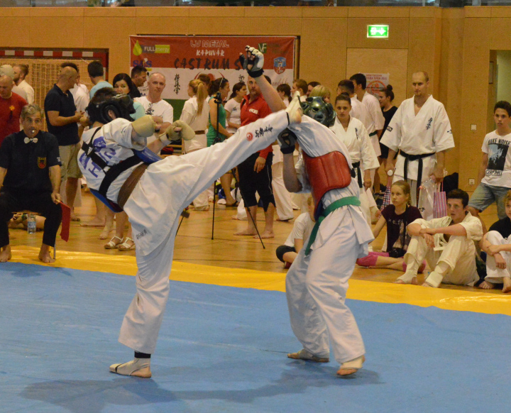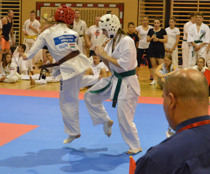 Vasárnap, június 14-én rendezték 11 ország, több mint 200 karatésának részvételével a 2015-ös AUSTRIAN OPEN-t Bécsben. Három Castrumos karatés végig verte az európai mezőnyt, három aranyéremmel, valamint egy ezüsttel tértek haza Kapuvárra. Ezzel a nemzetközi bajnoksággal karatésaink lezárták a tavaszi versenyidőszakot. Igazán szépen szerepeltek az idei tavaszi versenyszezonban, a Castrum SC karatésai. Utolsó (tanévzáró) versenyükön is sikerrel koronázták meg az ifi- és junior versenyzők a felkészülésük első féléves szakaszát. 11 ország képviselte magát a rangos osztrák versenyen Ausztria, Horvátország, Csehország, Oroszország, Grúzia, Svédország, Németország, Lengyelország, Bulgária, Lettország és Magyarország karatésai mérték össze erejüket, az osztrák fővárosban. Kisebb Európa bajnokságnak is beillett az erőpróba, ami kíváló lehetőséget biztosított a nemzetközi mezőnyben való bizonyításra a kapuváriaknak. Németh Veronika Ausztria Bajnoka Németh Veronika a levegőbenA Castrum SC junior -55kg-os Európa Bajnoka, ezúttal egy nagyobb súlycsoportban a -60 kg-osok közt remekelt, és bizonyította, hogy itt sincs ellenfele. A 9 fős csoportban első lengyel ellenfelét 46 mp alatt győzte le villámgyors fejrúgásokkal. Edzője kicsit "meg is orrolt rá", mert szeretett volna többet láltni, az edzésen begyakoroltakból. A következőkben már erre sem volt panasz. Veronika alkalmazta, és beépítette a harcba az otthon tanultakat, és ezt a küzdelmét is ipponnal zárta. A döntőre sajnos ellenfele nem állt ki ellene, így a további erőpróba még várat magára. Veronika 2015-ben, csak aranyérmet szerzett: - IV. Rakurai Kupa, Répcelak 1. hely - Diákolimpia elődöntő, Várpalota 1. hely - Diákolimpia Döntő, Veszprém 1. hely - Európa Bajnokság, Varsó 1. hely - Austrian Open, Wien 1. hely (5 aranyérem) Pantelics Bence arany- és ezüstérmes az Austrian Openen Pantelics Bence támadKATA és KUMITE (Formagyakorlat és Küzdelem) versenyszámokban is indult az ifjú Pantelics. A versenyen gyermek, serdülő, ifjúsági, junior és felnőtt formagyakorlatban is összemérhették az indulók a tudásukat. Bence az ifjúsági korcsoportban ezüstérmet szerzett, és csupán pár század ponttal maradt le a dobogó legfelső fokáról. Küzdelemben, az ifjúsági -65 kg-os súlycsoport volt az egyik legnépesebb mezőny. Itt 32-es tábláról indultak a dobogó csúcsa felé a karatékák, de ez csak Pantelics Bencének sikerült elérnie. 4 győztes küzdelem után, lengyel és magyar ellenfeleket legyőzve szerezte meg Ő is az osztrák bajnoki címet.Sikeresen alkalmazta az előző hét Valeri Dimitrov szemináriumán tanultakat. Villám lábával sorra szedte a wazarikat. Ha kellett vívott, ha kellett verekedett. Pantelics Bence 2015-ös versenyeredményei: - IV. Rakurai Kupa, Répcelak 2x 1. hely KATA formagyakorlatban és Küzdelemben is. - Diákolimpia elődöntő, Várpalota 2x 3. hely KATA formagyakorlatban és Küzdelemben is. (lázasan - influenzásan) - Diákolimpia Döntő, Veszprém 1. hely küzdelemben, 3. hely KATA formagyakorlatban. - IV. MAJOR CUP, Szlovákia 1. hely - XVII. J&S Speed Kupa Nemzetközi verseny, Tarján 1. hely - Austrian Open, Wien 1. hely küzdelemben és 2. hely KATA formagyakorlatban (6 arany-, 1 ezüst- és 3 bronzérem) Pantelics Bence, Németh Veronika és Németh Márk (hátul: Pantelics Péter) Németh Márk a -75 kg-os ausztriai bajnok Németh MárkA tanulás miatt (Sopronba jár iskolába) idén hanyagolta a versenyzést, de edzőjének Pantelics Péternek sikerült visszacsábítania a tatamira. A munka nem volt felesleges. Márk csak külföldiekkel vívta a csatáit. Három győztes küzdelem során (az egyiket 28 mp alatt) utasította maga mögé lengyel, cseh ellenfeleit. Ez az eredmény bizonyára további pozitív töltést biztosít majd a nyári felkészülés során az őszi Ifjúsági Európa Bajnokságra. Németh Márk 2015-ös versenyeredménye: - Austrian Open, Wien 1. hely Szépen zártuk a tavaszt "- Szépen zártuk a tavaszi versenyzezont, és nagyon elégedett vagyok az Ifi-, Junior csapatommal. Mind az elhivatottságuk, mind a hozzáállásuk példaértékű. Veronika és Bence nem csak a küzdőtéren, és az edzéseken bizonyítanak, de a Felsőbüki Nagy Pál Gimnáziumban is kíválóan helyt állnak. (Mindkettejük bizonyítványában csak egy db 4-es "csúfoskodott" a sok jeles mellett!) Úgy érzem ismét bebizonyosodott, hogy igen is lehet eredményesen sportolni, és kíválóan tanulni. Kapnak 2-3 nap pihenőt, és egy kicsit lazább, de azért komoly tempóval készülünk az edzőtáborokra, illetve az őszi versenyekre a nyáron. Novemberben még vár ránk egy Európa Bajnokság, amin a tavalyihoz hasonlóan szeretnénk szépen szerepelni. A nyár lesz alkalmas rá, hogy a heti 8-10 edzés szám meglegyen, és a Flóra Termálfürdő és Pappné Höfler Erika tanárnő segítségével szeretnénk úszással is színesíteni az edzésprogramot. " - mondta Pantelics Péter a Castrum SC elnöke Három aranyérmes a dobogó tetején, edzőjükkel A Castrum Köszöni a támogatást azoknak a cégeknek, akik nem csak erkölcsileg, de anyagilag is segítik versenyzőiket a sikerek elérésében! Kapuvár Város Önkormányzatának, Hámori György polgármesternek és a Képviselő Testületnek Full-Sopron Kft-nek, Bognár Csabának Vital-Feed KFT-nek Szabó Bélának, és Andreának S&S Festék Kereskedésnek - Simon Tibornak LV-Metál Kft-nek - Kiss Gézának HB Épületgépészetnek - Böcskör Zsoltnak Kapuvill KFT-nek, az Erzsébet királyné utcában A Bautech KFT-nek Bárkovics Zoltánnak és családjának A Rábaközi Nyomdának - Kovács Győzőnek és Barbinak Rozsits Ákosnak, aki fényt adott a felkészülés edzéseihez Kovács Sándornak, aki kifestette az edzőtermet Kozma Ács és Álványozásnak