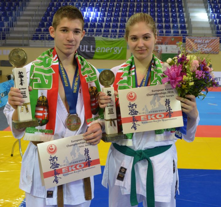 Grúziába is letették Kapuvár nevét a Castrum SC karatékái. Németh Veronika, Pantelics Bence és Végerbauer Roberta is a dobogó harmadik fokára állhatott fel a hétvégén rendezett Junior és Felnőtt Kyokushin Karate Európa Bajnokságon. Veronika és Bence is az 5. (!) Európa Bajnoki címüket vívták ki a hétvégén Tbilisziben. A Castrum válogatott versenyzői és edzőjük5 Castrumos karatéka 6 kvótával indult neki a szerdai napon Grúziának. A kapuváriak a korábbi válogató versenyen országos szinten a legtöbb kvótát vívták ki maguknak. Mielőtt útnak indultak, a Red Devils '91 kapuvári szurkoló tábortól 1-1 HUNGÁRIA feliratú szurkolói sálat kaptak ajándékba, melyet boldogan viseltek a sportolók a grúz arénában. Remek hasznát vették, hisz a Magyar Karate Válogatott 12 érmet, és 2 különdíjat harcolt ki a rangos nemzetközi versenyen. Ebből a 12-ből a Castrum sportolói, Pantelics Péter edző tanítványai 3 Európa bajnoki Bronzérmet tudhatnak magukénak! Mekkor teljesítmény is ez? 20 junior és 15 felnőtt magyar versenyző indult Grúziába, és természetesen az őket segítő edzők, és kísérők. Európa országaiból összesen 164 junior és 192 felnőtt versenyző gyűlt össze, országaik legjobbjaiként. Tehát bátran, minden szerénység nélkül kijelenthetjük, hogy a Castrum SC Kapuvár idén is kitett magáért a kontinens viadalon! Juniorok a pénteki napon. 2 bronzéremmel zártunk A megérkezést követően gyors pihenés, majd a másnapi orvosi vizsgálat előtt egy átmozgató edzés és egy apró wellness várt a versenyzőinkre, majd a helyi étel specialitások megkóstolása egy hangulatos étteremben. Péntek reggel pedig már kezdődtek is a KATA versenyek. Pantelics Bence Kata versenyszámban is indult a junior férfi kategóriában. Az arénában lehelyezett tatamik, teljesen újak voltak és nagyon csúsztak. Ennek ellenére Bence remek, hibátlan KATA-t mutatott be. A bírók viszont még ekkor gyakoroltak, és a főbíró számára is meglepő módon, a román fiút juttatták tovább. Így kicsit idegfeszítő hangulatban várták a küzdelmeket Bencéék.Pantelics Bence és Végerbauer Roberta Junior küzdelmek A junior női -55 kg-ban Bán Lilinek nem sikerült beverekednie magát az elődöntőbe. Litván ellenfelét ítélték harciasabbnak a bírák a hosszabbítást követően. Németh Márk a junior férfi -75 kg-ban hasonlóan járt, mint veszkényi földije Lili. Ő egy izraeli ellenfélen akadt fent, és a hosszabbítást követően már nem folytathatta tovább a versenyt. Végerbauer Roberta a junior női +60 kg-os kategóriában azeri ellenfelét a hosszabbítás utolsó másodperceiben búcsúztatta egy pontos fejrúgással. A döntőbe jutásért vívott csatában azonban litván vetélytársát hozták ki győztesnek a bírók. Itt volt némi torok ütés ami bejátszott, de tagadhatatlan, hogy most még az északi ország versenyzője érdemelte ki a tovább jutást. Végerbauer Roberta első Európa bajnokságán büszkén állhatott a dobogó harmadik fokára. Pantelics Bence minden KATA sérelmét szegény örmény ellenfelén orvosolta a junior férfi -70 kg-osok közt. A küzdelem 2 percét követően egyértelmű kapuvári győzelmet mutatott. Egy ukrán versenyzőn túl verekedve érkezett Bence az elődöntőbe, ahol egy litván "nyakig-láb" ellenfél vívta gigászi csatáját. A litván fiú egy frontális fejrúgással szerzett pontot, ami okozott némi orrvérzést. Bence rövid ápolást követően még nagyobb lendülettel vágott neki a hátralevő küzdőidőnek, ami sajnos már rövidnek bizonyult a mérkőzés megfordításához. Az ifjú Pantelics fiú ezzel a teljesítményével megszerezte 5. Európa Bajnoki címét, és mosolyogva állt a dobogó harmadik lépcsőjén.Felkészüléséhez a MOL Tehetségtámogató Program nyújtott segítséget az Új Európa Alapítványon keresztül. Pantelics Bence az Európa Bajnokság Junior -70 kg bronzérmese Felnőtt küzdelmek szombaton Németh Veronika EB III. helyezettNémeth Veronika, élete első felnőtt nemzetközi versenyén a női -55 kg-ban erősítette a magyar csapatot. Veronika azeri versenyzővel kezdett, akit a hosszabbításban kemény testrúgással fosztott meg a további szerepléstől. Ezt követően a bolgár Ivelina Petrován kellett túl jutni, hogy az elődöntőbe kerülhessen a vitnyédi gimnazista lány. Petrovával már az Ifi-, és Junior Európa bajnokságok során is mérkőzött, és most sem volt könnyű falat. A hosszabbítást követően azonban a bírák a magyar lányt találták harciasabbnak, és őt juttatták az elődöntőbe, ahol a spanyol Isis Pinilla kétszeres Európa bajnok várta. Az előző küzdelmek során összeszedett sérülés miatt, Veronika igaziból csak 3 végtagját tudta használni a katalán amazonnal szemben, ám ezzel is derekasan helyt állt, és keményen szorította spanyol vetélytársát, aki megérdemelten került a döntőbe. Németh Veronika ezzel a bronzérmével megszerezte 5. Európa Bajnoki címét úgy, hogy a versnyre készülést, és az érettségi vizsgákat is sikerült össze szinkronizálnia. Az edző csak az időt méri? "- Komoly feladatot jelentett az 4 junior versenyző segítése a pénteki napon, mivel elvoltak szórva a küzdelmeik a 3 küzdőtéren, és a biztonsági szolgálat is keményen akadályozta a versenyzők, és edzőik küzdőtér körüli mozgását. Többször is előfordult, hogy 2 Castrumos versenyzőm egyszerre vívta csatáját más-más tatamin. Ilyenkor Németh Veronika segített ki rutinosan az edzői munkában. Egy mobil aplikáció számításai szerint, 7 km-t (!) "sétálgat" az edző abban a sportcsarnokban, ahol versenyzőit segíti. A szombati nap már kevésbé volt stresszes, és igazán boldog vagyok, hogy ezeket a szép eredményeket sikerült elérnünk. A hangom pedig úgy gondolta, hogy e