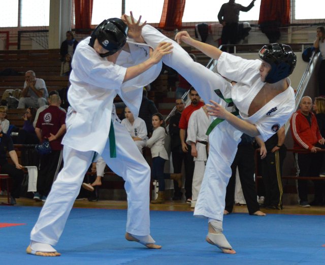 Nemrég még a 2016-os esztendő Castrumos kitüntetettjeiről számoltunk be, ma pedig az újabb 2017-es sikerekről szólnak a küzdősportos hírek. Szombaton, a várpalotai Diákolimpia Dunántúli elődöntőjéről 8 Castrumos versenyző 6 éremmel tért haza. Bemutatkoztak az "első versenyes" fiatalok is, akik belekóstolhattak a küzdősport világába. Diákolimpia elődöntő - Várpalota Bemelegítenek első versenyükre 348 fő nevezett 33 karate klub versenyzői. Kapuvárról, a Castrum SC 8 fővel képviselte magát. 3 első versenyes fiatalnak is szurkolhatott a csapat. Németh Jankó és Németh Virág a Gyermek I-es kategória férfi és női könnyűsúlyában, míg Hoffer András a Serdülő +60-as kategóriában mutatkozott be. Mindhárom versenyző először szembesült azzal, hogyan is zajlik egy ilyen verseny. Milyen az, mikor többszáz versenyzőtől, edzőktől és bíróktól zsong egy hatralmas sportcsarnok küzdőtere. Érthetően kicsit megvoltak illetődve, de a tatamin már elég harciasan küzdöttek. Jankó 2 remek fejrúgásával pontot is szerzett, ám mire igazán ráérzett volna a küzdelem rendszerére letelt a küzdőidő. Virág egy tapasztalt kéköves versenyző ellen igyekezett bizonyítani. Most még kevés sikerrel. András 3 körmérkőzést vívott ellenfeleivel, ügyesen gyűjtötte a pontokat, de a győzelemhez még több tapasztalatra és rutinra lesz szükség. Németh Jankó fejrúgása pontot ér Juniorok célja a dániai Európa bajnokság Túl jutni az elődöntőn, és bekerülni a veszprémi Diákolimpia döntőjének arany- és ezüstérmesei közé. Akiknek ez sikerül, azok képviselhetik majd hazánkat a kontinens viadalon. Kovács Róbert fejre támad Kovács Róbert hosszú idő kihagyása után tért vissza a küzdőtérre, és remek csatákat vívott a -65 kg-os junior férfi kategóriában. Egy "benézett" fejrúgás fosztotta meg a dobogó legfelső fokától. Pantelics Bence a junior -70 kg-os kategória favoritjaként osztotta villámgyors fejrúgásait, és erős ütéseit. Test KO-k, szép rúgások eredményeként gyűjtötte a wazarikat, ipponokat. Küzdelemben elért aranyérme mellé formagyakorlatban bronzérmet szerzett. Pantelics Bence pontot szerez Németh Márk (junior férfi -75 kg) megszerezte kategóriája aranyérmét. Gyors fejrúgásait ügyesen kamatoztatta, és egy kemény ki-ki meccset követően sikerült győznie a fehérvári Herczog Ádám ellen is. Bán Lili (junior női -55 kg) ezüstérmet szerzett. Első küzdelmében óvatlanságából kifolyólag ponthátrányból kellett visszafordítania, ami remekül sikerült. Aztán erős ütései rúgásai további győzelmeket szereztek a viadalok során. Ám a sorsdöntő küzdelemben VTSE-s vetélytársának mégis sikerült becsepésznie egy fejrúgást, és ezzel megfosztotta Lilit az arany csillogásától. Bán Lili Végerbauer Roberta (junior női +60 kg) Aranyérmének elvesztését figyelmetlenségének, és szabálytalanul kivitelezett technikáinak köszönhette. Ellenfele remekül fordította előnyére a Castrumos lány hibáit, aki hiába osztotta kemény rúgásait a többi küzdelemben, ezüstéremnél jobbra már nem számíthatott. Eredmények: Aranyérmesek: Pantelics Bence és Németh Márk Ezüstérmesek: Kovács Róbert, Bán Lili Végerbauer Roberta Bronzérmes: Pantelics Bence (KATA formagyakorlat) Twitter