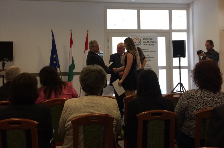 A Soproni Szakképzési Centrum és a Soproni Kereskedelmi és Iparkamara idén első alkalommal, ám hagyományteremtő szándékkal köszöntötte díjátadó ünnepségén a középiskolások országos tanulmányi, szakmai, sport és egyéb versenyein kiemelkedő eredményt elért tanulóit, tanárait és szakoktatóit, május 24-én. Ez alkalomból, Végerbauer Robertát, és edzője Sensei Pantelics Péter is átvehette a díjat. A 2016/17-es tanévben a szakképzési centrum 5 tagintézményének 30 tanulóját, 24 felkészítő tanárát, szakoktatóját, valamint edzőket és a gyakorlati oktatást végző vállalkozások oktatóit díjazta kiemelkedő teljesítményükért. A tanulók több országos versenyen is megmérettettek, többek között az Országos Szakmai Tanulmányi Versenyen (OSZTV), a Szakma Kiváló Tanulója Versenyen (SZKTV), az Ágazati szakmai érettségi vizsgatárgyak versenyén (ÁSZÉV), de részt vettek irodalmi, marketing és gasztronómiai versenyeken, Világ-, és Európa Bajnokságokon és Diákolimpián is. Végerbauer Roberta a Castrum SC Kapuvár Junior nehézsúlyú női Világ-, és Európa Bajnoka a Soproni Szakképzési Centrum, Porpáczy Aladár (Fertőd) tagintézményének tanulója. A május 24-i ünnepélyen a díjakat Králik Tibor, a Soproni Szakképzési Centrum főigazgatója, és Horváth Vilmos, a Kereskedelmi és Iparkamara elnöke adták át a Castrumos karate bajnoknak, és edzőjének. Végerbauer Roberta átveszi a díjat Gratulálunk a Díjazottaknak, és további jó eredményeket kívánunk!Twitter