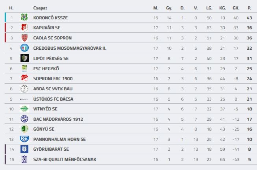 Megyei I.o . 18. fordulójában a Kapuvári SE felnőtt labdarúgó csapatának most sem sikerült győznie. CREDOBUS MOSONMAGYARÓVÁR II. - Kapuvári SE 3 - 2 (1-1) A szombati mérkőzésen, idegenben hagytuk a pontot. Kicsit bealudtak fiataljaink a pályán. Már a 2. percben vezetést szerzett a Móvár, és ezután csak "kullogtunk" az események után. Bár sikerült a 32. percben Matetits István góljával egyenlíteni, de Nagy Kevin Zsolt a második félidőben is a hálónkba talált. Majd a 76. percben ismét móvári találat pecsételte meg az esélyünket. Ennek ellenére a 90 percben Rózsavölgyi Patriknak sikerült még a szépítés, és így a 3-2-es végeredménnyel pont nélkül tértek haza labdarúgóink. Twitter