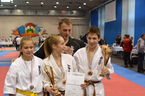 Három versenyzővel indult neki az Utánpótlás Magyar Bajnokságnak a Castrum csapata. A három harcos két aranyérmet, egy ezüstöt, és egy bronzérmet szerzett Nyíradonyban a Magyar Karate Szövetség 2014-es Magyar Bajnokságán. Kapuvár - Nyíradony 940 megtett km, és jó pár óra kocsikázás után boldog volt a hazafelé vezető út a hétvégi Kyokushin Karate Utánpótlás Magyar Bajnokságot követően. Az év legrangosabb hazai karate versenyét 399 nevezővel rendezték meg a nyírségben. A küzdelmek, és a formagyakorlatok 6 küzdőtéren zajlottak szombat reggel 8 -órától. A népes mezőnyben mindössze 3 kapuvári karatés mérettette meg magát, akik derekasan helyt álltak. Bán LiliMíg Bán Lili a -55 kg-os súlycsoport Ifjúsági kategóriban szerzett ezüstérmet, addig Németh Veronika a junior korcsoportban kiérdemelte a Magyar Bajnok-i címet. Veronika comb K.O-val, győzte nyírbátori riválisát, majd pápai ellenfelét két villám gyors fejrúgással engedte maga mögé a dobogón. Németh Veronika, Pantelics Bence, és Bán LiliPantelics Bence az Ifi fiú 65 kg-os korcsoportban K.O-zott testre, villantotta fejrúgásait, és hajtotta ellenfelét a páston kívül. Három küzdelem után, a Magyar Bajnoknak járó kupát Ő emelhette a nap végén a magasba.Kata formagyakorlatban egy ellépés miatt csak a bronzérmet kaphatta meg. Útban az Európa Bajnokságra "- Még két hetünk van az Ifjúsági Európa Bajnokságig, ahol Bán Lili és Pantelics Bence mellett Barzsó Rebeka is küzdőtérre lép. Ez a Magyar Bajnokság egy mérföldkő volt a felkészülésben. Igazi versenyhelyzetet az edzőteremben nem tudunk produkálni, ezért nagyon tanúlságos volt a hétvégi verseny számunkra. Az arany- és ezüstérem nem adhat okot, hogy elbízzuk magunkat. Van még rengeteg hiba, amit javítanunk kell, hogy azt mondhassák a sportolók: - Igen, felkészültünk! Köszönjük Kapuvár Önkormányzatának, és Bognár Csabának Full - Energy benzinkutakat üzemeltető Full-Sopron Kft ügyvezetőjének, valamint Kovács Győzőnek a Rábaközi Nyomda tulajdonosának, hogy lokálpatriótákként támogatják a kapuvári karatésok sikereit! Minden erőnkkel azon vagyunk, hogy dicsőséget szerezzünk a Castrumnak, és Kapuvárnak. Úgy vélem, méltó helyre kerülnek a szponzori feliratok a novemberi Európa Bajnokságon." - nyilatkozta Pantelics Péter, a Castrum SC elnöke. Bán Lili, Németh Veronika, Pantelics Bence - hátul Pantelics Péter További képek a Castrum SC Facebook oldalán >>> Twitter