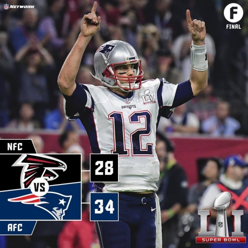 Hajnalban játszották az 51. Super Bowl-t. Az Atlanta Falcon csapata remekül uralta a mérkőzést, melynek meg is lett az eredménye. Az első félidőben New England Patriots - Atlanta Falcon 3 - 21. Aztán a következő játékrészben hihetetlenül fordított a New England. A végeredmény döntetlen lett, majd a rájátszást touchdownnal nyerték a fehér mezes New Englandiak. A Falcon első touchdownja Több rekord is megdőlt a Super Bowl-ok történelmében. Ami viszont az egyik legnagyobbnak számít, hogy még sohasem volt döntetlen. Vasárnaptól viszont ezt sem mondhatják már el Amerikában. A New England patriots játékosai ugyanis az első félidőben 3 - 21 -es állásról fordítani tudtak, majd a teljes játékidő végére 28 - 28-ra hozták fel az eredményt. Minden ami az első játékrészben nem akart összejönni, azt a másodikban remekül orvosoltak, és az immár ötszörös Super Bowl bajnok irányítójuk Tom Brady szinte csodát tett. A hosszabbításban pedig touchdownnal beállították a 38 - 24-es végeredményt. Twitter