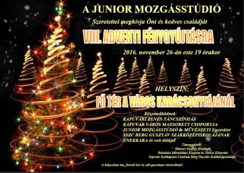 A Junior Mozgásstúdió idén 8. alkalommal rendezi meg Adventi Fénygyújtás c. programját. Szeretettel várnak mindenki 2016. november 26-án Kapuvár város Fő terén, a város karácsonyfája körül! Twitter