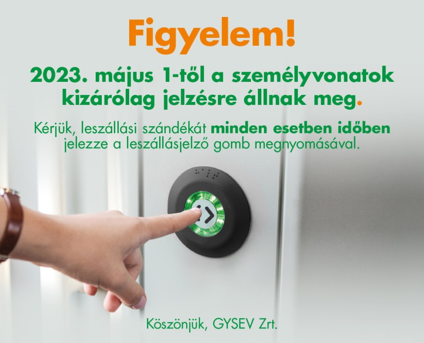 Tájékoztatjuk a GYSEV utasait, hogy 2023. május 1-től a GYSEV Zrt. hálózatán feltételes megállási rendet vezetnek be. Ennek értelmében a személyvonatok kizárólag jelzésre állnak meg, ezért fontos, hogy az utasok leszállási szándékukat minden esetben időben jelezzék!Twitter