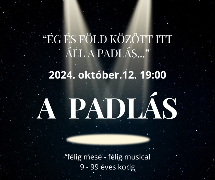 Október 1-től jegyek vásárolhatók A PADLÁS című előadásra. Jegy árak: I. helyre: 9000 Ft. III. helyre ( 20. sor): 4000 Ft. Presser Gábor és Sztevanovity Dusán közismert dalaival fűszerezett darabja az egyik legsikeresebb magyar musical. Az "Ég és föld között" elhelyezkedő padlás Rádiósának, az oda tévedő négy szellemnek és a gengszter Barabásának a történetén már generációk nőttek fel. A félig mese-félig musical kiváló szórakozást nyújt gyermekeknek és felnőtteknek egyarántTwitter