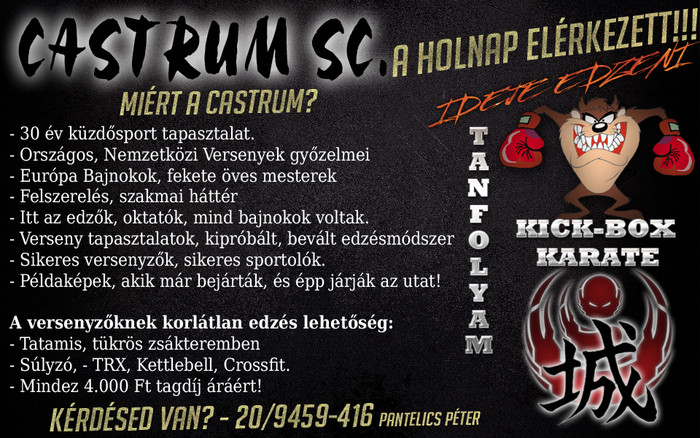 Hamarosan megkezdődik az iskola, és tanulás mellett, sokan mozgás kehetőséget keresnek gyereküknek, vagy épp önmaguknak. Mindenki tudja, hogy szükség van a mozgásra, mégis hajlamosak megfeledkezni róla. A Castrum új Kick-box, Kyokushin Karate és Kölyök Torna tanfolyamokat indít szeptembertől Kapuváron. A mozgás fontossága A 80-as években felnőni, egyenlő volt a mindennapi mozgással. Akkoriban a gyerekek folyamatosan sportoltak, mozogtak. Mindenhova gyalogolt, vagy kerékpározott az ember a városban. Nem volt számítógép, csak 2 TV csatorna volt, és az élelmiszerek is egészégesek voltak. A gyerekek folyamatos mozgásban voltak. Ma már 2014-et írunk. Van számítógép, mindenhol folyik az internet. Van 1000 Tv csatorna, és mindenki autóval közlekedik. Az ételek műanyagok, a gyerekek túlsúlyosak, allergiásak, cukorbetegek, vagy épp más gondokkal küzdenek. Egy biztos: - fele annyit sem mozognak, mint a 80-as, 90-es évek gyerekei. Sokat hallunk a mozgás fontosságáról, tudjuk, hogy kell, mégsem ösztönözzük gyerekeinket, hogy mozogjanak. A XXI. század testnevelése A mindennapos testnevelést 2012-ben vezették be, a 2014/2015-ös tanévben így már az 1-3., az 5-7., illetve a 9-11. osztályban lesz kötelező. Két órát kiválthatsz diáksportköri tevékenységgel, illetve versenyszerű sportolással, ha a diák rendelkezik egyesületi tagsággal vagy amatőr sportolói sportszerződéssel. Ez ugye azzal jár, hogy a gyerek 7 vagy akár 8 órát is elölt majd az iskolában. Itt a lista, milyen tantárgyak lesznek az iskolákban >>> A gyermek fáradt lesz, és ugyan kinek lesz kedve ennyi iskola után, még otthon is nekiállni tanulni? A sport szerepe A sport az, ami képes arra, hogy ne csak elfárassza az embert, hanem fel is élénkítse. Egy kiadós testmozgás után, agyunk újra képes a szellemi megterhelésre, a tanlásra. Felfrissíti a gyereket, és élénké teszi a mozgás. Küzdősport, Karate, Kick-box Kapuváron A Castrum SC-ben több mint 30 éve foglalkoznak karatéval, 12 éve pedig Kick box oktatással az edzők. Az egyesületben több száz fiatal megfordult, és megpróbálkozott a kyokushin karatéval, vagy a Kick-box-val ezalatt az idő alatt. A sportolók sikeréről portálunk folyamatosan beszámol, és tájékoztat. Volt nagyon sok tehtséges fiatal, akik szép sikereket értek el, de igaziból azok a fiatalok érték el a legnagyobb sikereket, akik nem voltak tehetségesek. Kicsit ducik voltak, kétbalkezesek, kétballábasok, vagy épp alacsonyak, vagy túl magasak . Ők azok, akik elszántságot mutattak az edzéseken, és több munkát fektettek be, hogy legyőzzék tehetséges társaikat. Ezek a sportoló fiatalok, azok, akik Európa Bajnokságokon vettek, vesznek részt, és egy olyan rendszerben élnek, amit csak az érthet meg, aki ezt kipróbálja. Rendszert visz az életedbe A küzdősport nem azért küzdősport, mert az ellenfél legyőzése a cél. Mindenkinél van jobb, és lesz is jobb. A küzdősportban a cél, ÖNMAGUNK legyőzése! Fontos mottó: - Légy jobb, annál az embernél, aki tegnap voltál! Ha ezt a céltudatosságot sikerül elérni, akkor érthetővé válik, hogyan képes egy küzdősportoló beosztani az idejét úgy, hogy tudjon versenyidőszakban akár napi 2x edzeni, természetesen tanulni, és még a játékra is jusson idő.Ha csak a Castrum berkeiben nézünk körül, akkor bátran példaként említhetjük Licskai Dávidot, Garab Gergelyt, akik európa bajnoki sikerekkel büszkélkedhetnek, és mellette az orvosi egyetemet végzik, és helyt állnak nem akármilyen eredményekkel. De bátran említhetjük Fábián Márkot, aki idén 490 pontot gyűjtött (500 -ból), és gyógyszerésznek jelentkezett, ahova természetesen fel is vették. Fontos megjegyezni Csikai Bencét, Dömötör Zsanettet, Majoros Krisztinát, Dukai Sándort, Kozák Pétert, Bak Sándort, Molnár Imrét és a többi főiskolát, egyetemet végzett sportolót, kik tanulmányi eredményeihez nagyban hozzájárult a küzdősport. Ők mind, rendszert kaptak, és megtanulták beosztani az idejüket. Miért a Castrum SC? Az elmúlt 30 évben, az egyesület vezetősége, edzői, olyan szakmai tapasztalatokra tettek szert, mind a korábbi években a küzdőtéren, mind pedig az elkövetkezendő években a versenyzők mögött állva, hogy ezen hozzáértésük kimagasló sikereket hozott Kapuvárnak. A rendszert, amit Csitei Béla edzőjüktől tanultak, folyamatosan fejlesztik, és a "Kapuvári stílust" használva érik el a versenyzőik a sikereket. Tudásuk, tanításuk mind-mind saját megtapasztalásukon alapszik. Az elmúlt 30 évben összegyűlt az a felszerelés mennyiség, és szakmai tudás, amivel szerénység nélkül lehet állítani, hogy az edzők Európa legjobbjai közé tudják vezetni azt a versenyzőt, aki vállalja a felkészülést.A CASTRUM egy olyan márka ami nem csak a Kyokushin Karate mezőnyben, de a Kick-box ringben is egyre nagyobb teret hódit. (Magyar Zoltán és Molnár Imre sikerei olvashatók itt). Az oktatásban nagy hangsúlyt fektetnek az utánpótlás nevelésre, és dr. Szalainé Zsemlye Mónika, és Pappné Kovács Edit irányításával már 2-3 éves kortól fogalkoznak a gyerekek mozgásfejlesztésével, a Castrum Kölyök Torna szakosztályában. Szeptembertől Kick-box, Karate, Kölyök Torna tanfolyamok Bár a tagfelvétel folyamatos, mégis célszerű ősszel becsatlakozni a Castrum tanítványok közé, mivel ilyenkor teljesen az alapoktól kezdik oktatni a fiatalokat a harcművészetre. Ilyenkor várnak mindenkit, fiút - lányt, fiatalt, vagy az idősebb korosztályhoz tartozót, hogy megszerettessék velük a mozgást, önbizalmat, testet, és lelket erősítsenek. Megtanítsák nekik az önvédelmet, a küzdelmet, vagy épp a funkcionális edzések (TRX, KETTLEBELL, CROSSFIT) alapjait, hogy a sportolóik sikeresek legyenek ezáltal az élet bárme