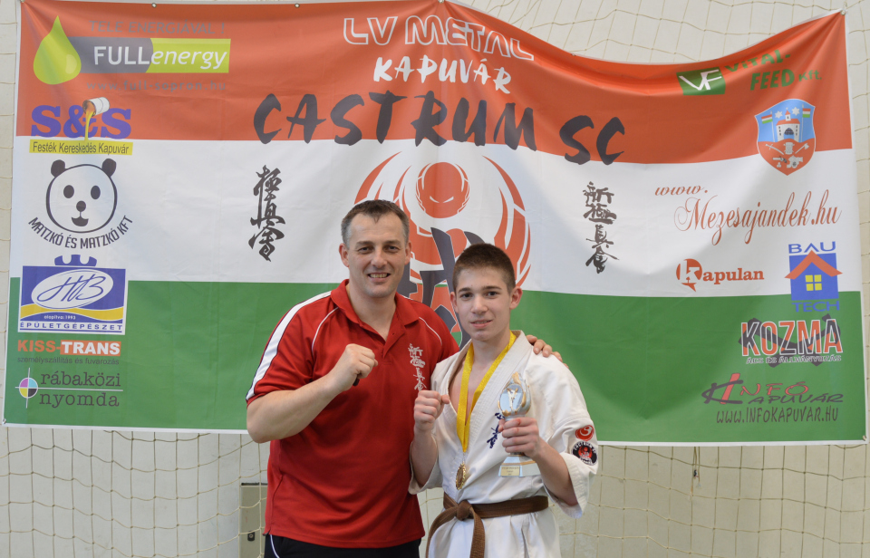 Magyarország, Horvátország, Ausztria és Szlovákia 460 kyokushin versenyzője küzdött a győzelemért, a XVII. J&S Speed kupán a hétvégén Tarjánban. A Castrum 7 éremmel tért haza Kapuvárra. Nem lehet túl korán elkezdeni a sportot A nemzetközi karate versenyen 13 kapuvári karatéka lépett tatamira a népes mezőnyben. Először a legfiatalabbak vívták küzdelmeiket, majd a nap végére maradtak az ifjúsági versenyzők küzdelmei. Orbán Bence a Gyerek II. abszolut kategóriában diadalmaskodott sorozatosan. Ellenfelei nem bírtak megállni, a harcos Castrumos előtt. Aranyérmét boldogan vehette át, a dobogó tetején. A Castrum nagy meglepetése, az osli Kozma Levente, aki a legutóbb aranyérmet szerzett Szlovákiában, és immár Magyarországon is bizonyította, hogy számolni kell vele, mikor a dobogós helyeket osztják. Leventének ez volt élete 2. komolyabb versenye, és még csak most kezdi megízlelni a küzdelem, és az adrenalin zsongás ízét. Ezüstérme nagyon dícséretes. Jerkó Dominik szintén a Gyerek II-s kategóriában vívta csatáit. Valahogy ezen a versenyen nem igazán sikerült minden úgy ahogy tervezték, de bronzérme maximálisan megérdemelt ugyanúgy, mint edzőtársának, Szalai Sámuelnek is. Bán Lili Bán Lili két korcsoportban is egy-egy ezüstöt szerzett Az Ifjúsági -55 kg-ban Lili fejrúgásokkal, és lendületével küzdötte magát a dobogó második fokáig, majd rövid pihenő után, Junior Gála mérkőzéseket vívott egy másik szabályrendszerben 4 társával. Harciasságával itt is ezüstérmet szerzett, és már elmondhatja, hogy sikeresen belekóstolt, a junior korcsoport küzdelmeibe is. Pantelics Bence fejre talál Pantelics Bence mindegyik küzdelmét Ipponnal nyerte Az ifjúsági -70 kg-ban, a kapuvári gimnazista megállíthatatlan volt. Első küzdelmében KO győzelmet aratott, majd a második küzdelmét mintegy 24 mp alatt zárta rövidre, két gyors fejrúgásával. Majd a döntőben is bevetette gyors lábát, és erős ütéseit, melynek Ippon lett az eredménye. Aranyérmmes küzdelmével zárták a XVII. J&S Speed kupát. Aranyérmesek: Orbán Bence, és Pantelics Bence Ezüstérmesek: Kozma Levente és Bán Lili (ifjúsági és junior korcsoportban is) Bronzérmesek: Jerkó Dominik, Szalai Sámuel Gy.II.ffi_35kg:Castrumosok sorban I. Fehér Levente Full-Contact Szolnok II. Fehér Áron Victory III. Bathó Balázs Full-Contact SzolnokIII. Jerkó Dominik Castrum Gy.II.ffi_45kg: I. Csibra Barnabás Yakuzák SeII. Kozma Levente Castrum III. Neubauer Mátyás Siófok KSE III. Varga István SBKSE Gy.II.ffi_+55kg: I. Orbán Bence Castrum II. Torma Máté BHMSE III. Poór Sándor Kende Kemecse SE Srd.ffi_42kg:Szalai Sámuel harcban I. Szajka Bendegúz Yakuzák Se II. Fris Gergely BHMSEIII. Szalai Sámuel Castrum III. Gál Barnabás Yakuzák Se Ifi.ffi_70kg: I. Pantelics Bence Castrum II. Kelemen Balázs Renmei se III. Juhász Bertold Bendiák Dojo Ifi.női_60kg: I. Mező Lili Yakuzák SeII. Bán Lili Castrum III. Cheyenne Dokter Griff SE III. Gyurcsák Nikolett Stabilitas Apa és fia- Pantelicsok Twitter