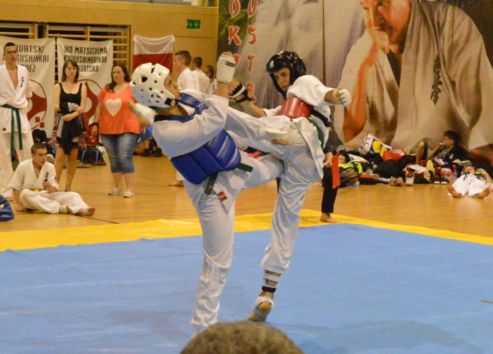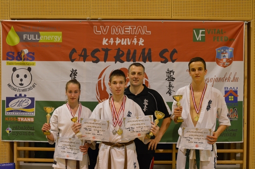 Vasárnap, június 14-én rendezték 11 ország, több mint 200 karatésának részvételével a 2015-ös AUSTRIAN OPEN-t Bécsben. Három Castrumos karatés végig verte az európai mezőnyt, három aranyéremmel, valamint egy ezüsttel tértek haza Kapuvárra. Ezzel a nemzetközi bajnoksággal karatésaink lezárták a tavaszi versenyidőszakot. Igazán szépen szerepeltek az idei tavaszi versenyszezonban, a Castrum SC karatésai. Utolsó (tanévzáró) versenyükön is sikerrel koronázták meg az ifi- és junior versenyzők a felkészülésük első féléves szakaszát. 11 ország képviselte magát a rangos osztrák versenyen Ausztria, Horvátország, Csehország, Oroszország, Grúzia, Svédország, Németország, Lengyelország, Bulgária, Lettország és Magyarország karatésai mérték össze erejüket, az osztrák fővárosban. Kisebb Európa bajnokságnak is beillett az erőpróba, ami kíváló lehetőséget biztosított a nemzetközi mezőnyben való bizonyításra a kapuváriaknak. Németh Veronika Ausztria Bajnoka Németh Veronika a levegőbenA Castrum SC junior -55kg-os Európa Bajnoka, ezúttal egy nagyobb súlycsoportban a -60 kg-osok közt remekelt, és bizonyította, hogy itt sincs ellenfele. A 9 fős csoportban első lengyel ellenfelét 46 mp alatt győzte le villámgyors fejrúgásokkal. Edzője kicsit "meg is orrolt rá", mert szeretett volna többet láltni, az edzésen begyakoroltakból. A következőkben már erre sem volt panasz. Veronika alkalmazta, és beépítette a harcba az otthon tanultakat, és ezt a küzdelmét is ipponnal zárta. A döntőre sajnos ellenfele nem állt ki ellene, így a további erőpróba még várat magára. Veronika 2015-ben, csak aranyérmet szerzett: - IV. Rakurai Kupa, Répcelak 1. hely - Diákolimpia elődöntő, Várpalota 1. hely - Diákolimpia Döntő, Veszprém 1. hely - Európa Bajnokság, Varsó 1. hely - Austrian Open, Wien 1. hely (5 aranyérem) Pantelics Bence arany- és ezüstérmes az Austrian Openen Pantelics Bence támadKATA és KUMITE (Formagyakorlat és Küzdelem) versenyszámokban is indult az ifjú Pantelics. A versenyen gyermek, serdülő, ifjúsági, junior és felnőtt formagyakorlatban is összemérhették az indulók a tudásukat. Bence az ifjúsági korcsoportban ezüstérmet szerzett, és csupán pár század ponttal maradt le a dobogó legfelső fokáról. Küzdelemben, az ifjúsági -65 kg-os súlycsoport volt az egyik legnépesebb mezőny. Itt 32-es tábláról indultak a dobogó csúcsa felé a karatékák, de ez csak Pantelics Bencének sikerült elérnie. 4 győztes küzdelem után, lengyel és magyar ellenfeleket legyőzve szerezte meg Ő is az osztrák bajnoki címet.Sikeresen alkalmazta az előző hét Valeri Dimitrov szemináriumán tanultakat. Villám lábával sorra szedte a wazarikat. Ha kellett vívott, ha kellett verekedett. Pantelics Bence 2015-ös versenyeredményei: - IV. Rakurai Kupa, Répcelak 2x 1. hely KATA formagyakorlatban és Küzdelemben is. - Diákolimpia elődöntő, Várpalota 2x 3. hely KATA formagyakorlatban és Küzdelemben is. (lázasan - influenzásan) - Diákolimpia Döntő, Veszprém 1. hely küzdelemben, 3. hely KATA formagyakorlatban. - IV. MAJOR CUP, Szlovákia 1. hely - XVII. J&S Speed Kupa Nemzetközi verseny, Tarján 1. hely - Austrian Open, Wien 1. hely küzdelemben és 2. hely KATA formagyakorlatban (6 arany-, 1 ezüst- és 3 bronzérem) Pantelics Bence, Németh Veronika és Németh Márk (hátul: Pantelics Péter) Németh Márk a -75 kg-os ausztriai bajnok Németh MárkA tanulás miatt (Sopronba jár iskolába) idén hanyagolta a versenyzést, de edzőjének Pantelics Péternek sikerült visszacsábítania a tatamira. A munka nem volt felesleges. Márk csak külföldiekkel vívta a csatáit. Három győztes küzdelem során (az egyiket 28 mp alatt) utasította maga mögé lengyel, cseh ellenfeleit. Ez az eredmény bizonyára további pozitív töltést biztosít majd a nyári felkészülés során az őszi Ifjúsági Európa Bajnokságra. Németh Márk 2015-ös versenyeredménye: - Austrian Open, Wien 1. hely Szépen zártuk a tavaszt "- Szépen zártuk a tavaszi versenyzezont, és nagyon elégedett vagyok az Ifi-, Junior csapatommal. Mind az elhivatottságuk, mind a hozzáállásuk példaértékű. Veronika és Bence nem csak a küzdőtéren, és az edzéseken bizonyítanak, de a Felsőbüki Nagy Pál Gimnáziumban is kíválóan helyt állnak. (Mindkettejük bizonyítványában csak egy db 4-es "csúfoskodott" a sok jeles mellett!) Úgy érzem ismét bebizonyosodott, hogy igen is lehet eredményesen sportolni, és kíválóan tanulni. Kapnak 2-3 nap pihenőt, és egy kicsit lazább, de azért komoly tempóval készülünk az edzőtáborokra, illetve az őszi versenyekre a nyáron. Novemberben még vár ránk egy Európa Bajnokság, amin a tavalyihoz hasonlóan szeretnénk szépen szerepelni. A nyár lesz alkalmas rá, hogy a heti 8-10 edzés szám meglegyen, és a Flóra Termálfürdő és Pappné Höfler Erika tanárnő segítségével szeretnénk úszással is színesíteni az edzésprogramot. " - mondta Pantelics Péter a Castrum SC elnöke Három aranyérmes a dobogó tetején, edzőjükkel A Castrum Köszöni a támogatást azoknak a cégeknek, akik nem csak erkölcsileg, de anyagilag is segítik versenyzőiket a sikerek elérésében! Kapuvár Város Önkormányzatának, Hámori György polgármesternek és a Képviselő Testületnek Full-Sopron Kft-nek, Bognár Csabának Vital-Feed KFT-nek Szabó Bélának, és Andreának S&S Festék Kereskedésnek - Simon Tibornak LV-Metál Kft-nek - Kiss Gézának HB Épületgépészetnek - Böcskör Zsoltnak Kapuvill KFT-nek, az Erzsébet királyné utcában A Bautech KFT-nek Bárkovics Zoltánnak és családjának A Rábaközi Nyomdának - Kovács Győzőnek és Barbinak Rozsits Ákosnak, aki fényt adott a felkészülés edzéseihez Kovács Sándornak, aki kifestette az edzőtermet Kozma Ács és Álványozásnak