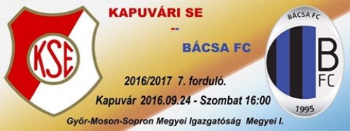 A Megyei I. osztály 7. rangadóján, Bácsa csapatát fogadtuk Kapuváron. A Vendég csapat vitte a három pontot. az 1:2-es végeredményt követően. Bár az első félidő 7. percében Horváth Róbert góljával vezetést szereztünk, még sem sikerült tartanunk az előnyt. Röpke 10 perc múlva Nyíregyházki Norman góljával megérkezett az egyenlítés, illetve a 39. percben Gajdos Krisztián beállította az 1 - 2-es végeredményt. Csapatunk jelenleg a 9. helyen várja a következő mérkőzést.Twitter