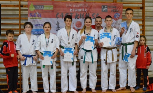 Nemrég még a 2016-os esztendő Castrumos kitüntetettjeiről számoltunk be, ma pedig az újabb 2017-es sikerekről szólnak a küzdősportos hírek. Szombaton, a várpalotai Diákolimpia Dunántúli elődöntőjéről 8 Castrumos versenyző 6 éremmel tért haza. Bemutatkoztak az "első versenyes" fiatalok is, akik belekóstolhattak a küzdősport világába. Diákolimpia elődöntő - Várpalota Bemelegítenek első versenyükre 348 fő nevezett 33 karate klub versenyzői. Kapuvárról, a Castrum SC 8 fővel képviselte magát. 3 első versenyes fiatalnak is szurkolhatott a csapat. Németh Jankó és Németh Virág a Gyermek I-es kategória férfi és női könnyűsúlyában, míg Hoffer András a Serdülő +60-as kategóriában mutatkozott be. Mindhárom versenyző először szembesült azzal, hogyan is zajlik egy ilyen verseny. Milyen az, mikor többszáz versenyzőtől, edzőktől és bíróktól zsong egy hatralmas sportcsarnok küzdőtere. Érthetően kicsit megvoltak illetődve, de a tatamin már elég harciasan küzdöttek. Jankó 2 remek fejrúgásával pontot is szerzett, ám mire igazán ráérzett volna a küzdelem rendszerére letelt a küzdőidő. Virág egy tapasztalt kéköves versenyző ellen igyekezett bizonyítani. Most még kevés sikerrel. András 3 körmérkőzést vívott ellenfeleivel, ügyesen gyűjtötte a pontokat, de a győzelemhez még több tapasztalatra és rutinra lesz szükség. Németh Jankó fejrúgása pontot ér Juniorok célja a dániai Európa bajnokság Túl jutni az elődöntőn, és bekerülni a veszprémi Diákolimpia döntőjének arany- és ezüstérmesei közé. Akiknek ez sikerül, azok képviselhetik majd hazánkat a kontinens viadalon. Kovács Róbert fejre támad Kovács Róbert hosszú idő kihagyása után tért vissza a küzdőtérre, és remek csatákat vívott a -65 kg-os junior férfi kategóriában. Egy "benézett" fejrúgás fosztotta meg a dobogó legfelső fokától. Pantelics Bence a junior -70 kg-os kategória favoritjaként osztotta villámgyors fejrúgásait, és erős ütéseit. Test KO-k, szép rúgások eredményeként gyűjtötte a wazarikat, ipponokat. Küzdelemben elért aranyérme mellé formagyakorlatban bronzérmet szerzett. Pantelics Bence pontot szerez Németh Márk (junior férfi -75 kg) megszerezte kategóriája aranyérmét. Gyors fejrúgásait ügyesen kamatoztatta, és egy kemény ki-ki meccset követően sikerült győznie a fehérvári Herczog Ádám ellen is. Bán Lili (junior női -55 kg) ezüstérmet szerzett. Első küzdelmében óvatlanságából kifolyólag ponthátrányból kellett visszafordítania, ami remekül sikerült. Aztán erős ütései rúgásai további győzelmeket szereztek a viadalok során. Ám a sorsdöntő küzdelemben VTSE-s vetélytársának mégis sikerült becsepésznie egy fejrúgást, és ezzel megfosztotta Lilit az arany csillogásától. Bán Lili Végerbauer Roberta (junior női +60 kg) Aranyérmének elvesztését figyelmetlenségének, és szabálytalanul kivitelezett technikáinak köszönhette. Ellenfele remekül fordította előnyére a Castrumos lány hibáit, aki hiába osztotta kemény rúgásait a többi küzdelemben, ezüstéremnél jobbra már nem számíthatott. Eredmények: Aranyérmesek: Pantelics Bence és Németh Márk Ezüstérmesek: Kovács Róbert, Bán Lili Végerbauer Roberta Bronzérmes: Pantelics Bence (KATA formagyakorlat) Twitter