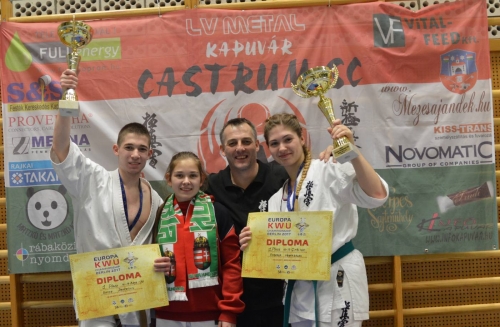 Ismét domborított a Castrum! Március 18-án Berlinben arattak győzelmeket városunk karate diákolimpia bajnokai. A KWU Junior Európa Bajnokságon a legeredményesebb magyar csapatként szerepeltek Pantelics Péter tanítványai. 4 világszervezet, 24 országának 560 legjobb versenyzői küzdöttek az Európa Bajnoki címekért. Tudj meg többet a KWU-ról KWU = Kyokushin-kan, KWF és IFK három világszervezet a kyokushin karatéban. Mindegyikük Európa- és világversenye önmagában is óriási eseménynek számít, mely a legjobbak seregszemléje szerte a világon. Néhány éve azonban KWU (Kyokushin World Union) néven ezek a szervezetek létrehoztak egy szerveződést, melyhez később partnerként a Shinkyokushin világszervezet is csatlakozott. A szerveződés célja közös versenyeken a versenyzők megmérettetése és így ténylegesen a világ legjobbjainak kiválogatása. Nem titkolt, bár távoli cél még a knock-down karate bejuttatása az olimpiai játékok programjába. Castrumosok a KWU EB-n Veszprémi Diákolimpia döntőjén aranyérmes három versenyző /Bán Lili, Végerbauer Roberta és Pantelics Bence/ edzőjükkel, Pantelics Péterrel utaztak Berlinbe, az Európa bajnokságra. A kapuvári harcosokon kívül Székesfehérvárról, Jászberényből, Sopronból és Debrecenből is érkeztek versenyzők. Bán Lili a 2016-os Világbajnok bolgár lánnyal kezdett, akit sajnos még nem sikerült legyőznie, viszont bátran kijelenthető, hogy a -55 kg női súlycsoport legkeményebb mérkőzését produkálták. Végerbauer Roberta a junior női nehézsúlyban előbb egy lengyel, majd egy orosz, végül egy bolgár lányt búcsúztatott. Roberta így megőrizte 2016-ban megszerzett világbajnoki címét, és orosz ellenfelének nem sikerült revansot vennie a szófiai vereségért. Pantelics Bence a junior férfi -70 kg-ban orosz, örmény, majd 2 lengyel ellenfélen is túl verekedve magát állhatott a dobogó legfelső fokára. Bence még nincs 18 éves, de megszerezte élete 6. (!) Európa Bajnoki helyezését. Ezúttal egy újabb aranyérmet. A Castrum 2 aranyérmet szerzett, ezzel (ismét) a legeredményesebb magyar csapatként érkeztek haza. A Magyar csapat az előkelő 6. helyen végzett az éremtáblán. 1.Russian Federation 11 Gold 12 Silver 19 Bronze – Total 422.Kazakhstan 11 Gold 6 Silver 3 Bronze – Total 203.Bulgaria 5 Gold 2 Silver 6 Bronze – Total 134.Poland 3 Gold 6 Silver 12 Bronze – Total 215.Sweden 3 Gold 0 Silver 1 Bronze – Total 46.Hungary 2 Gold, 3 Silver, 2 Bronze – Total 7 A Castrumot ezen a versenyen is támogatóik és szurkolóik segítették a sikerhez! Külön köszönet az Új Európa Alapítványnak, aki Pantelics Bencét segíti eredményei elérésében! Twitter
