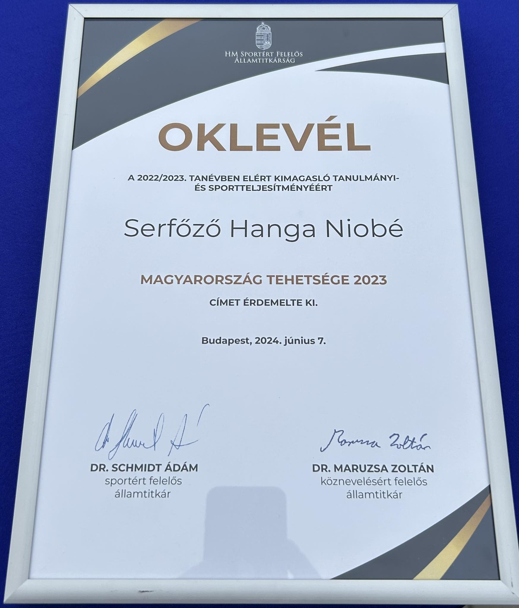 Pénteken, ünnepélyes keretek közt vehette át "Magyarország Tehetsége 2023" kitüntetést a Duna Arénában Budapesten, Serfőző Hanga Niobé Dr. Schmidt Ádám, sportért felelős államtitkártól. A 2022/2023. tanévben elért kimagasló tanulmányi és sportteljesítményekért járó kitüntetésre 980 pályázó nevezett. A 750 db sikeres pályázó közül a legjobb 72 sportolót hívták meg 2024. június 07-n a Duna Arénába. A középiskolások "Magyarország Tehetsége 2023" díjban részesültek. A díjakat ünnepélyes keretek közt Dr. Schmidt Ádám, Sportért felelős államtitkár adta át a fiatal tehetségeknek. Serfőző Hanga Niobé már az előző tanévben is megkapta ezt a díjat. A Győri Tánc- és Képzőművészeti Iskola tanulója kitűnő (5.0) bizonyítványa, és Európa bajnoki aranyérmének köszönhetően nem csak az oklevelet, de az ország 36 legeredményesebb sportolója mellett edzőjével Sensei Pantelics Péterrel, Ő is kiérdemelte a személyes részvételt. A díjazottak közt asztaliteniszezők, többek közt 2-3 és 5 tusázók, vízilabdázók és harcművészek voltak. Gratulálunk Hangának, szüleinek, pedagógusainak és edzőjének! View the embedded image gallery online at: https://www.infokapuvar.oyabun.hu/sport/item/2355-serfozo-hanga-niobe-magyarorszag-tehetsege-2023#sigProId98c2651eed Twitter